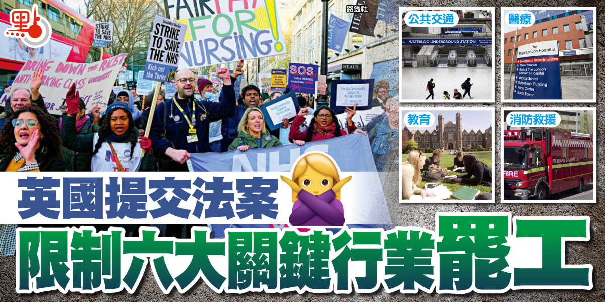 英國在今個冬季面對連串罷工行動,英國政府10日向議會提交了一項反罷工法案,要求公共交通、醫療、教育、消防等六大關鍵公共服務行業在工人罷工期間維持「最低限度」服務。反對黨工黨和各大工會則強烈抗議,批評當局侵犯工人的罷工權。