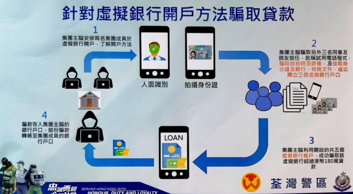 警方指,去年8月首先在黃大仙區拘捕1名30歲男子,相信他是集團主腦。調查期間警方向銀行查詢,發現該犯案集團曾安排2名成員到虛擬銀行開戶,以了解開戶的程序。之後該主腦在一間本地非牟利機構任職時,訛稱替2男1女同事試玩換臉的手機程式,替3名受害人多次及多角度拍攝照片,再伺機偷取受害人的身份證明文件及稅單等,最後成功通過虛擬銀行的認證而騙取貸款。