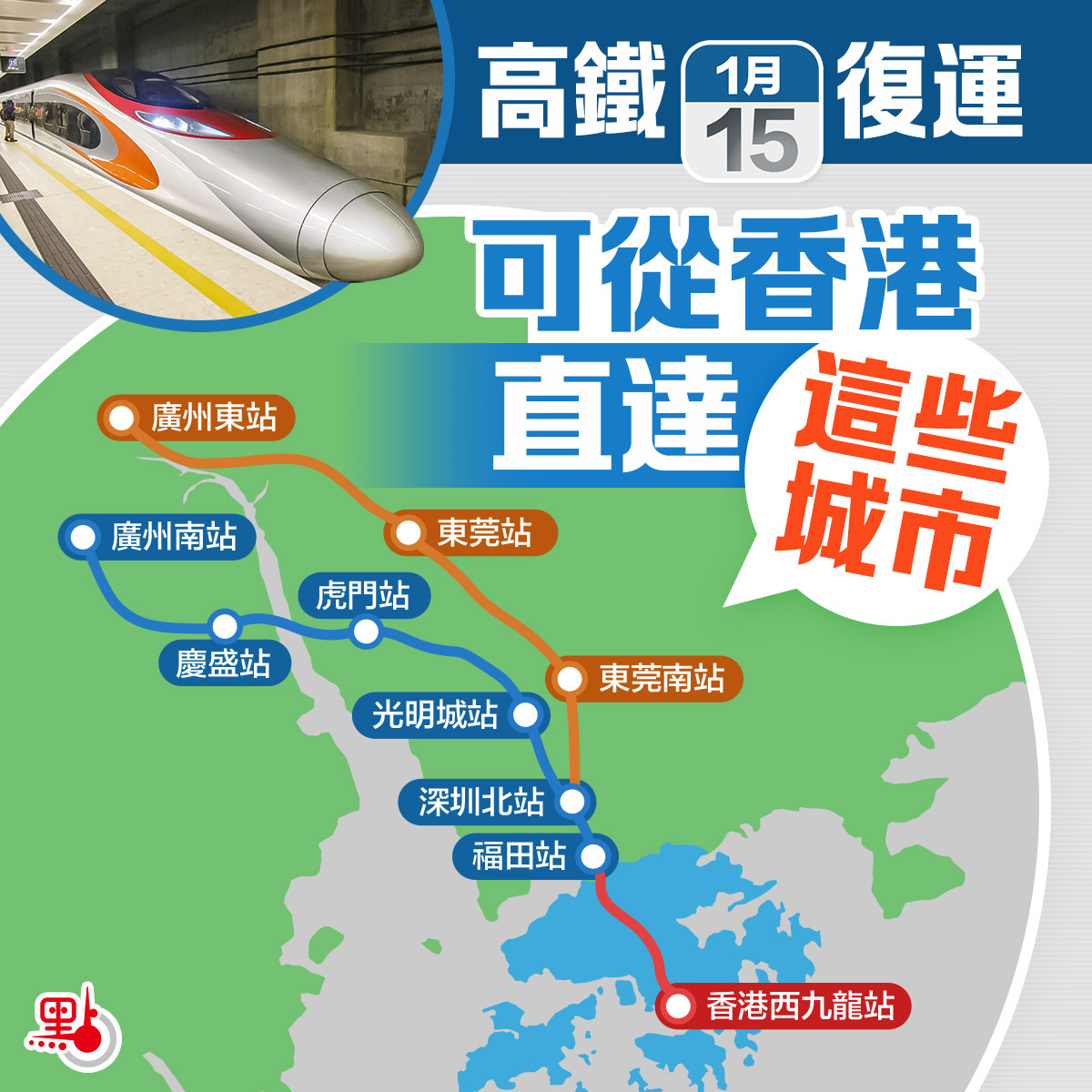 復運初期,高鐵將恢復短途服務,途經福田、深圳北、廣州南,增設廣州東站,中途站包括光明城、虎門、慶盛及新增的東莞南和東莞站。重開後,高鐵香港段連接的內地站點將增至61個。
