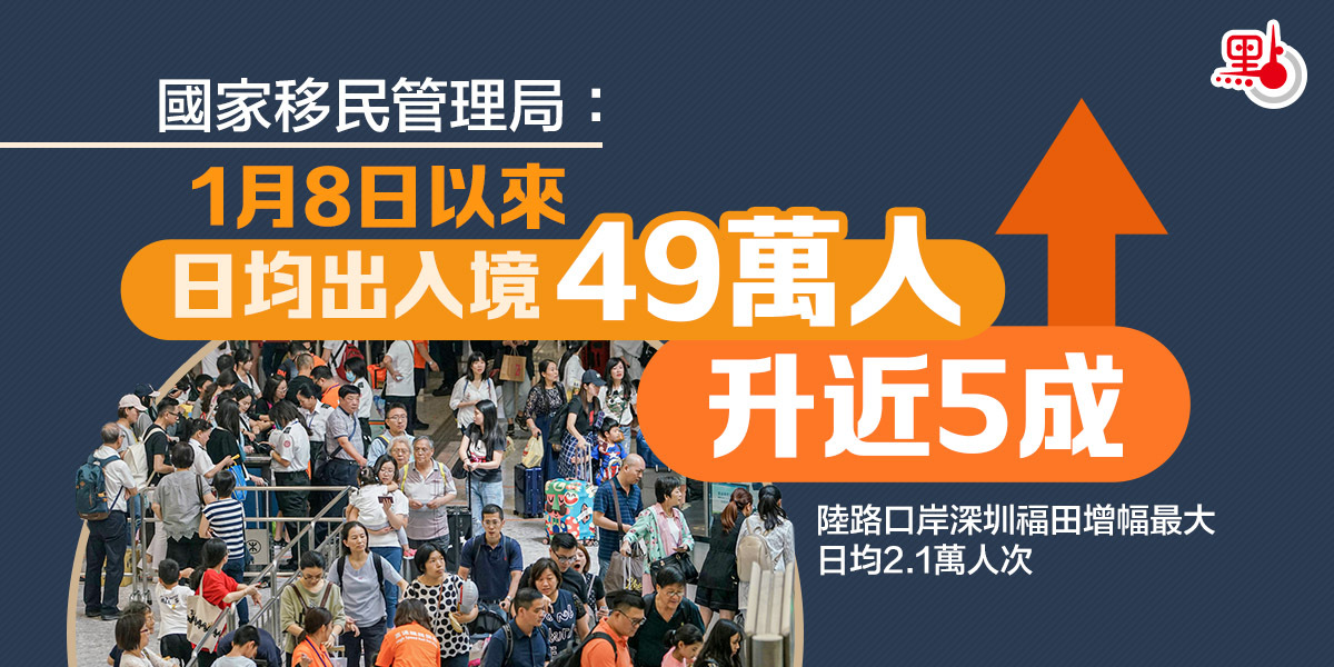 一是總量明顯上升。1月8日至12日,全國移民管理機構日均檢查出入境人員49萬人次,較「乙類乙管」政策措施實施前上升48.9%,是2019年同期的26.2%;
