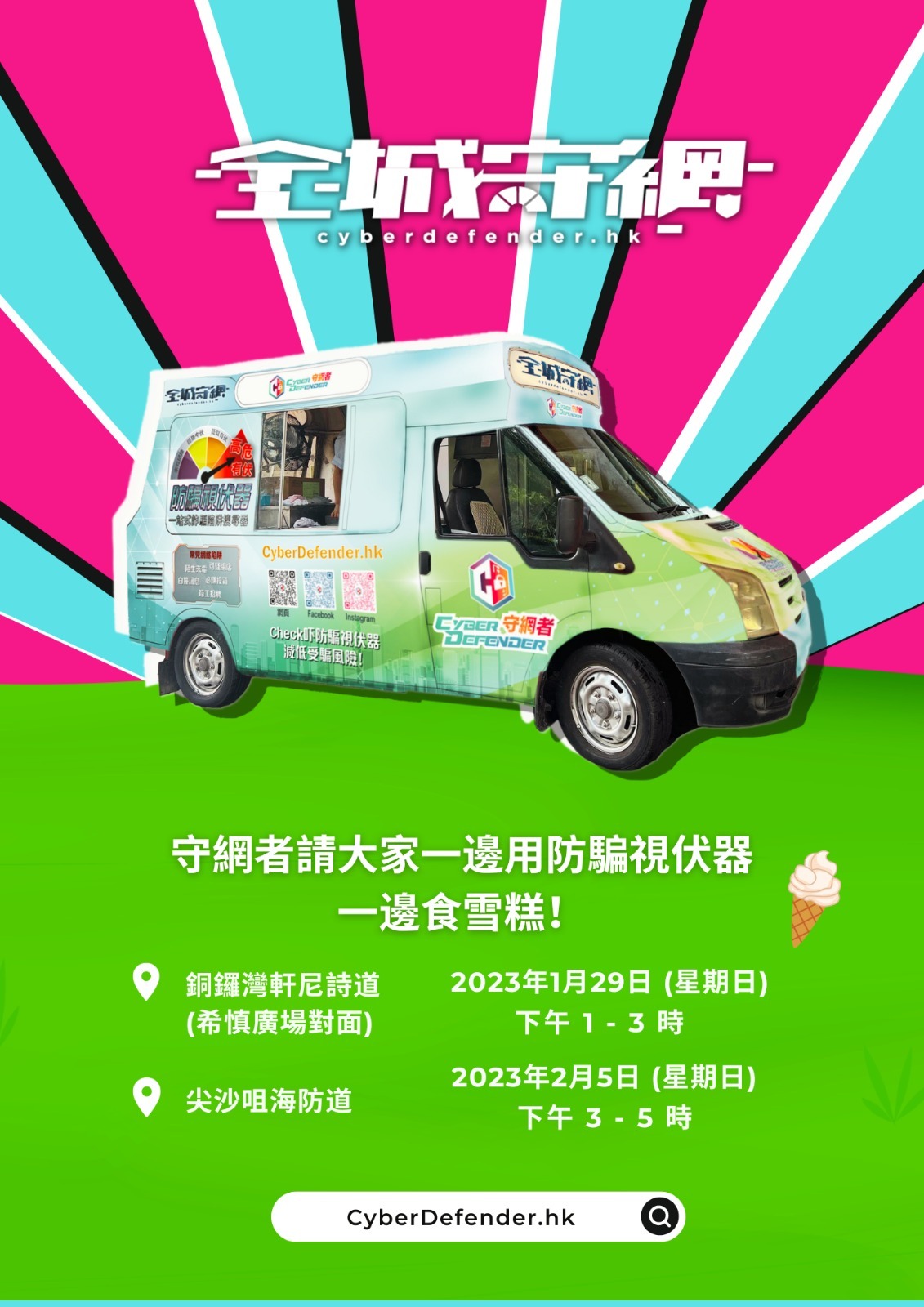 為推廣人氣網上平台「守網者」的一站式詐騙陷阱搜尋工具「防騙視伏器」(Scameter) 和提升市民對網上詐騙的警覺性,警務處網絡安全及科技罪案調查科特別預備了「全城守網」雪糕車巡迴港九作出宣傳活動。