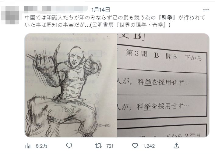 經考生討論及媒體報道,該失誤在日本網友間引起熱議,這一話題也一度成為日本推特上的熱搜。不少網友用虛構的出版社「民明書房」編出「科拳」的內容,形容中國古代的知識人不僅要考文更要比武。有人模仿「科舉錄取率不到10%」虛構指,「參加科拳考試的人死亡率有9成」。關於出現這種失誤的原因,有網友猜測可能是考卷電子錄入的人不認識「科舉」這個詞,看錯稱「科拳」。