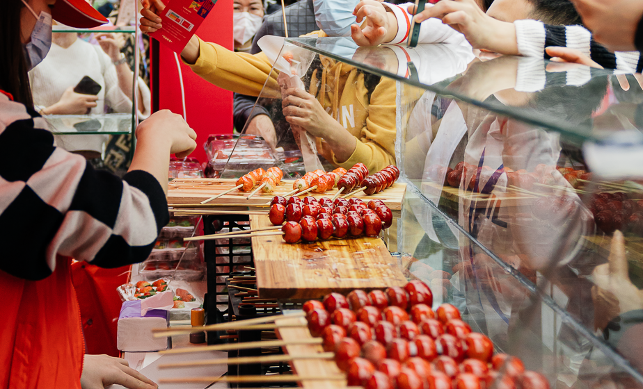 花市一共分為5個區域,包括花卉展銷區、新年活動區、零食活動區、年貨食品區、春聯飾品區與文創工藝區,共設置343個攤位。順着人流走走停停,從街頭逛到街尾大約20分鐘。冰糖葫蘆是每年花市最熱門的店舖之一,剛開市檔口就排滿了人,走在路上看見的小朋友基本人手一根。這大概是深圳長大的人共同的童年回憶吧,每年一定要先和花市門口的生肖裝置合個影,再買兩束冬青,才是深圳的年味。