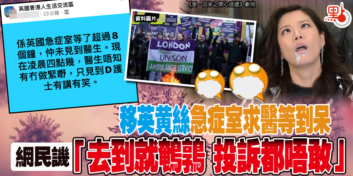 喺英國睇醫生好難,撞正近排工潮持續,更加係難上加難。有一名移民英國嘅黃絲在網上發文賣慘話,晚上到急症室求醫,但苦等8小時後,至凌晨4點幾,仍未得到醫生診治。有網民揶揄移民黃絲「去到就鵪鶉,投訴都唔敢」、「仲重可以打fb,咁應問题不大,可以等多20小時啦」。
