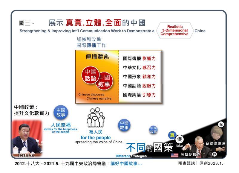 改變這形勢,國家反撃是提升社會的軟實力;其次在內容方面要求「展示真實的中國」。一正一邪,實話對謊言,邪不能勝正將會顯現。