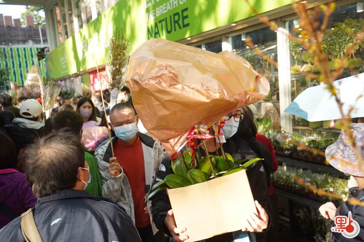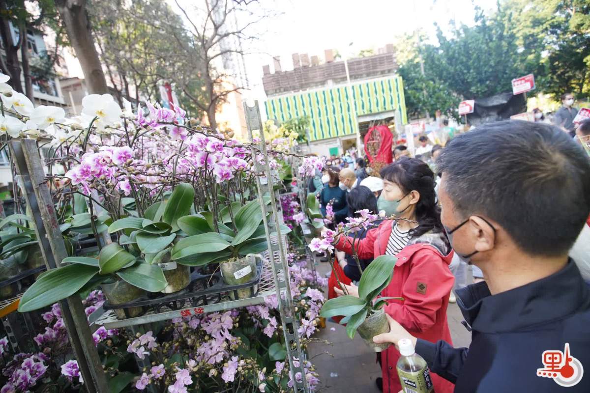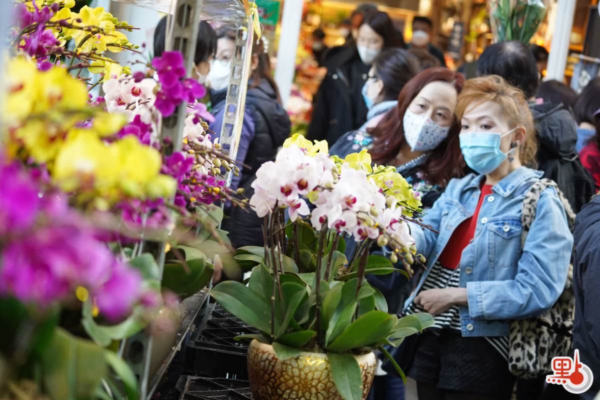 點新聞記者今日(19日)在現場所見,花墟人頭湧湧,現場人花爭路,色彩鮮艷的鮮花大賣。花墟一眾花店擺滿了各種鮮花盆景供市民選購,諸如諧音「吉」的盆桔、象徵一家團的「黃金果」、蝴蝶蘭,均大受歡迎。雖然今日是工作日,仍有大批市民前來光顧買花、詢問品種、以及包裝鮮花,不少人都滿載而歸。