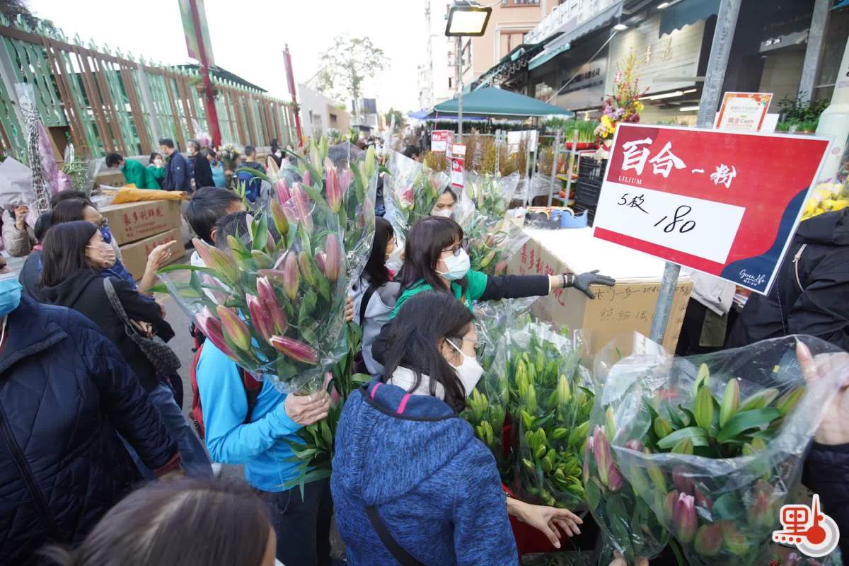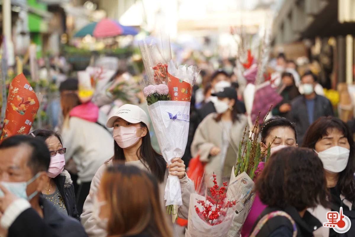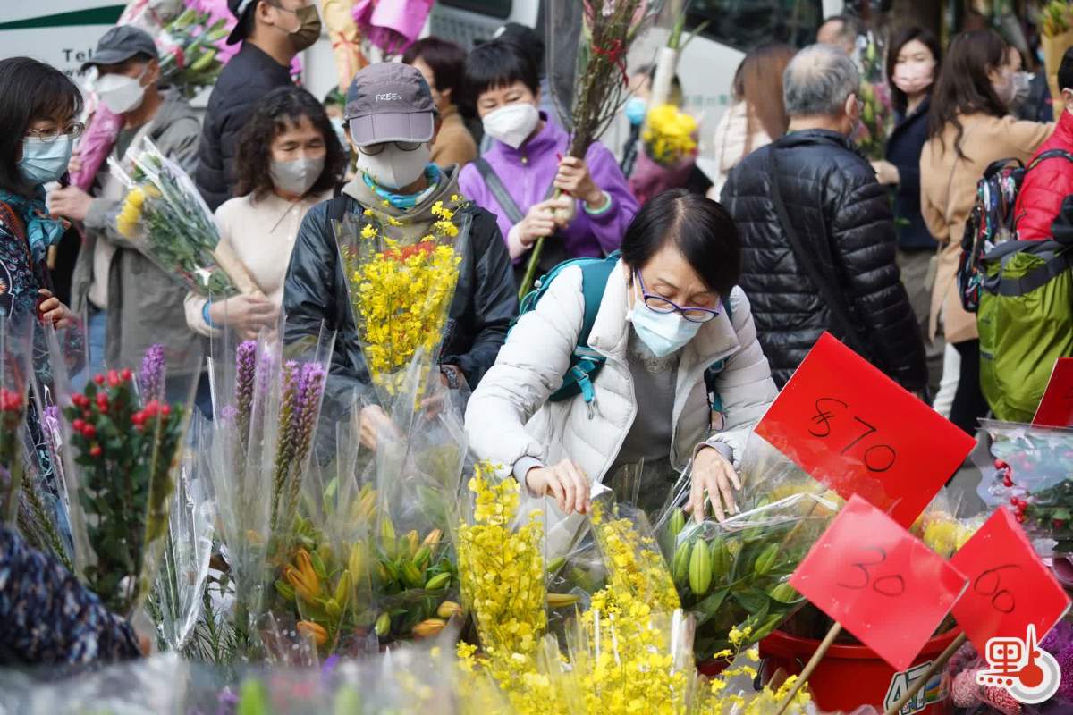 農曆新年將至,大批市民逛花市、挑選年花祈求「花開富貴」。旺角花墟近日開始有較多人流出現,不少市民攜帶手推車前來入貨,表明因為今年疫情好轉、天氣尚好,「個個都開心」,會比往年用更多預算買年花,例如桃花、百合等,唯獨受到封路影響未能泊車在商舖前購物,感到不太方便。