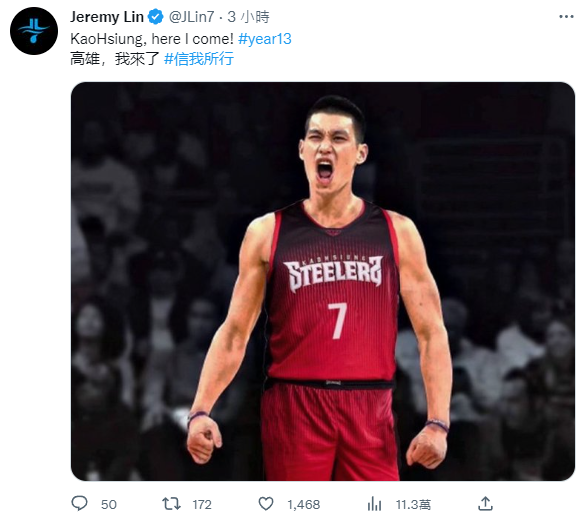 美籍華裔球星林書豪加盟台職籃球隊高雄鋼鐵人,預計下月報到。林書豪今日(26日)在社交網站上載穿上新球會7號球衣宣傳照,表示「高雄,我來了」。