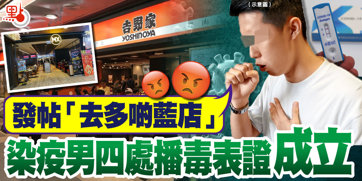 水果店男職員在染上新冠病毒期間,涉嫌故意多次外出「播毒」,更在fb發帖稱「超過兩年無去過吉野家,今日喉嚨痛、口淡淡,想食湯米,明嘅就明」、「林鄭你要攬炒,我實去多啲藍店」,又在個人fb戶口發布快測陽性的照片。