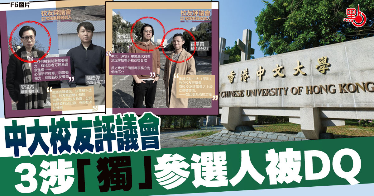 香港中文大學校友評議會將於本月25日舉行周年會員大會,選出兩名選任常委及兩名補任常委,引來黃黑校友覬覦,更報名參選。中大校友評議會常委會近日宣布取消3名曾涉黑暴及播「獨」的參選者資格。