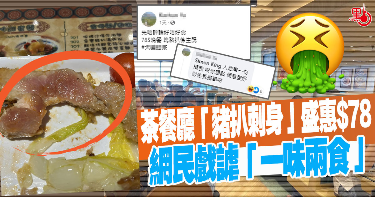 新年流流,小心禍從口入!近日有網民發文表示,在大圍幫襯一間連鎖茶餐廳,點了一份78蚊的晚餐,卻換來「塊豬扒係生嘅」。帖文一出即引來網民熱議,紛紛留言戲稱「豬扒刺身」、「一味兩食,煎同刺身,78元抵食」、「夠嫩,盡顯功架」;亦有人批評「好過分,咁都可以上枱」、「不如直接原材料上枱吖笨」,建議事主向食環署投訴。