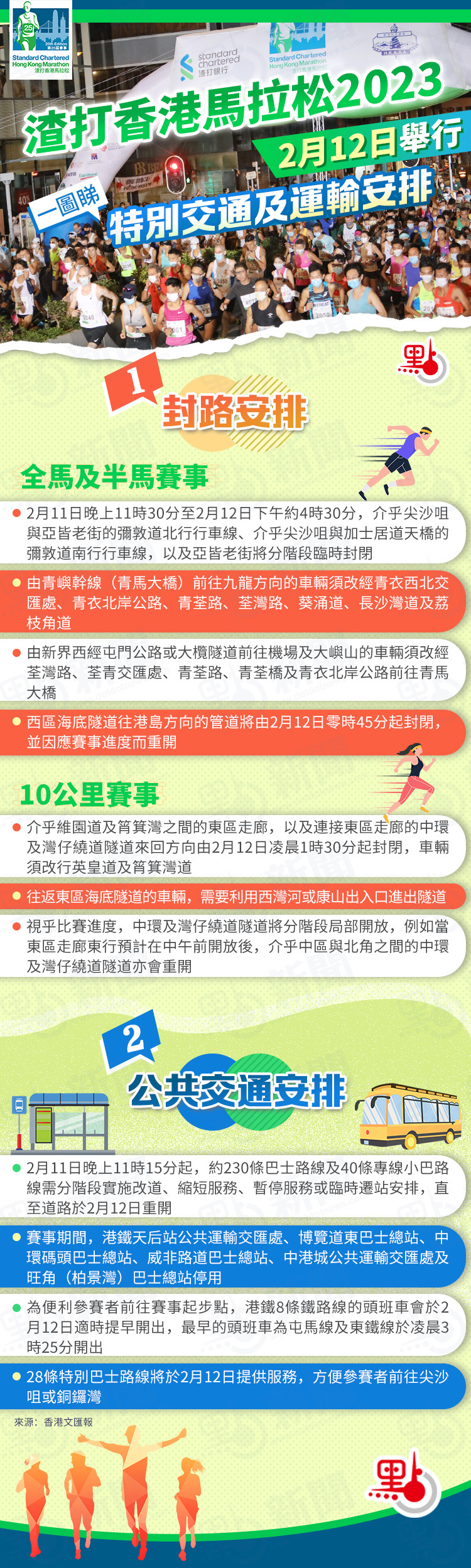 因新冠疫情順延舉行的第25屆渣打香港馬拉松將於周日(12日)上演,今屆賽事的名額由上屆1.85萬人倍增至3.7萬人並全數爆滿,所有跑手均不需要於賽前提供核酸檢測或快測陰性結果證明,但維持佩戴口罩的要求,即於起跑線前及衝線後都必須戴上口罩。警方及運輸署表示,周六晚起全港多處將分階段實施臨時封路安排,約230條巴士路線及40條專線小巴路線將暫停服務或改道,同日港鐵8條鐵路線將提早開出頭班車,另有28條特別巴士路線方便參賽者前往起點。渣馬舉行當日的交通及運輸安排有哪些調整?快來一圖睇清!