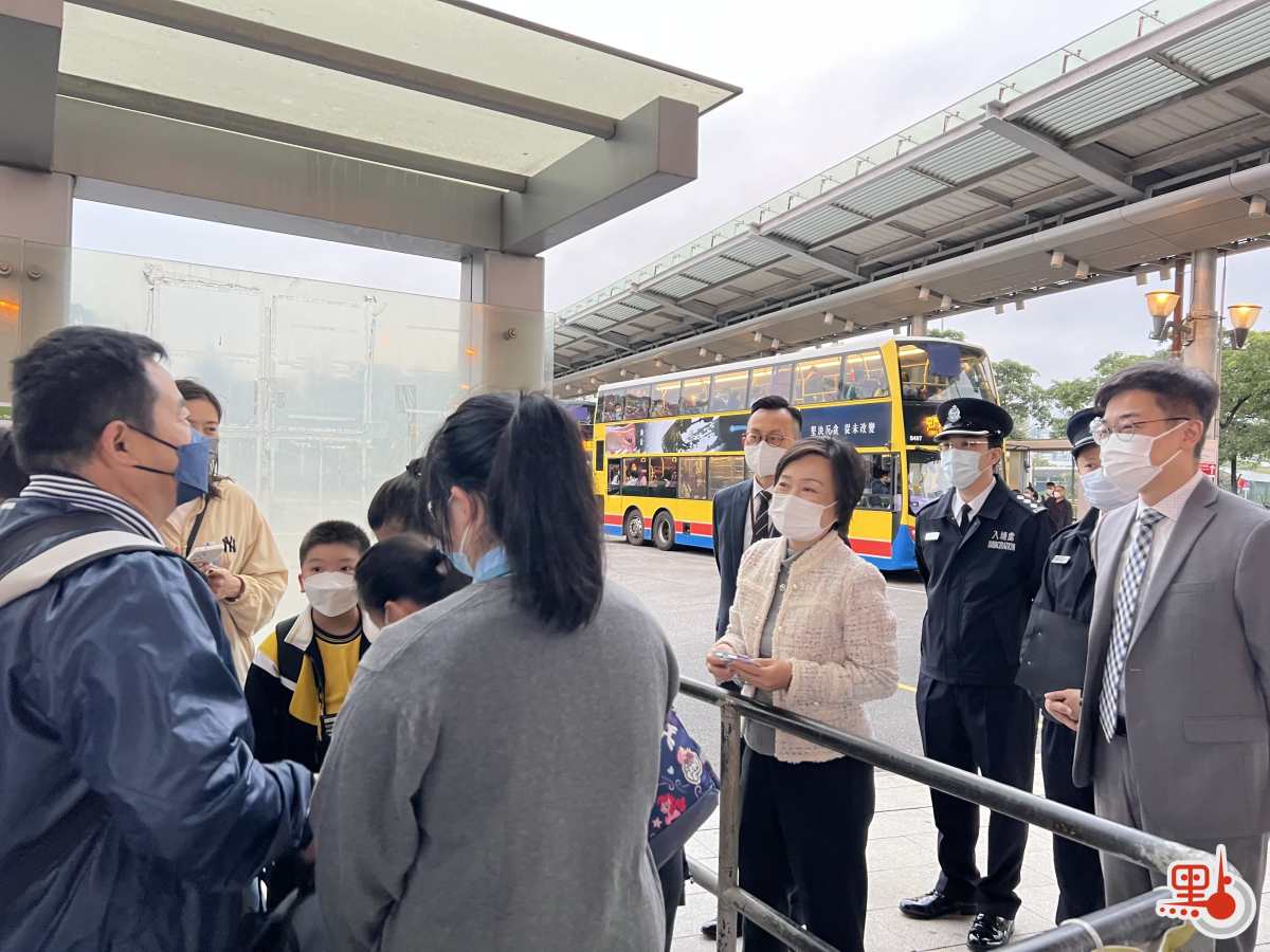 本港與內地全面通關,今日(8日)起中學跨境學生回港上課,小學生、幼稚園及特殊學校跨境學生則於2月22日起回港。教育局局長蔡若蓮早晨到深圳灣口岸,巡視跨境生通關及換乘交通情況。