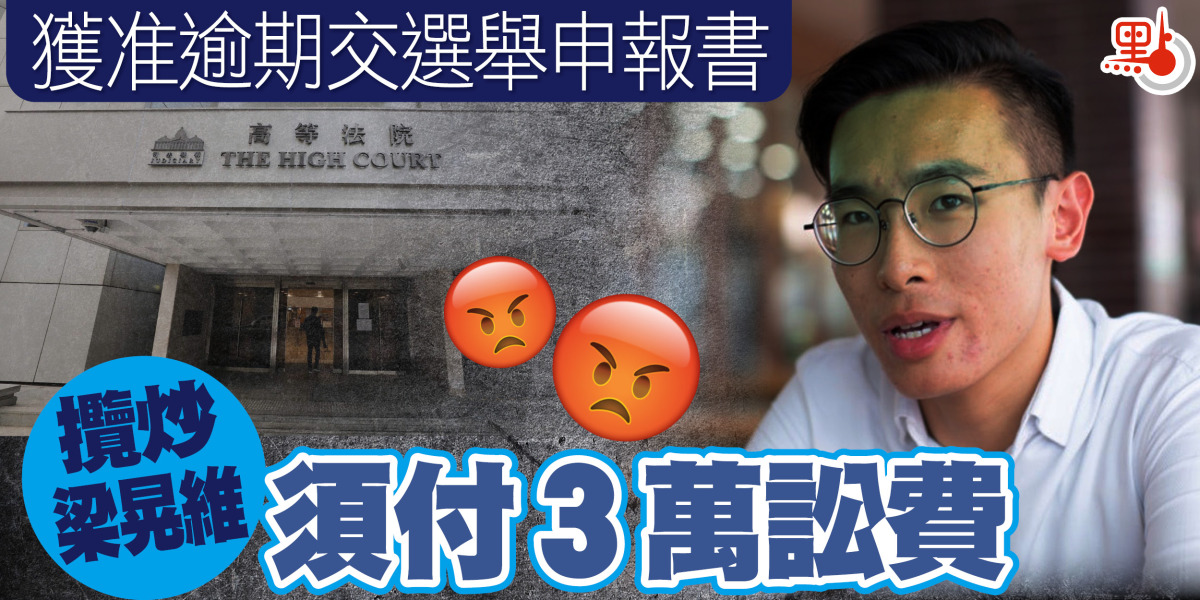非法初選案其中一名認罪被告梁晃維,2020年參選立法會選舉時被DQ,及後無依時提交選舉申報書。他早前向高等法院申請逾期提交申報書,以及豁免提交部分被警方國安處帶走的選舉開支收據。法官高浩文昨天頒判詞批准,另下令他須向律政司支付近3萬元訟費。