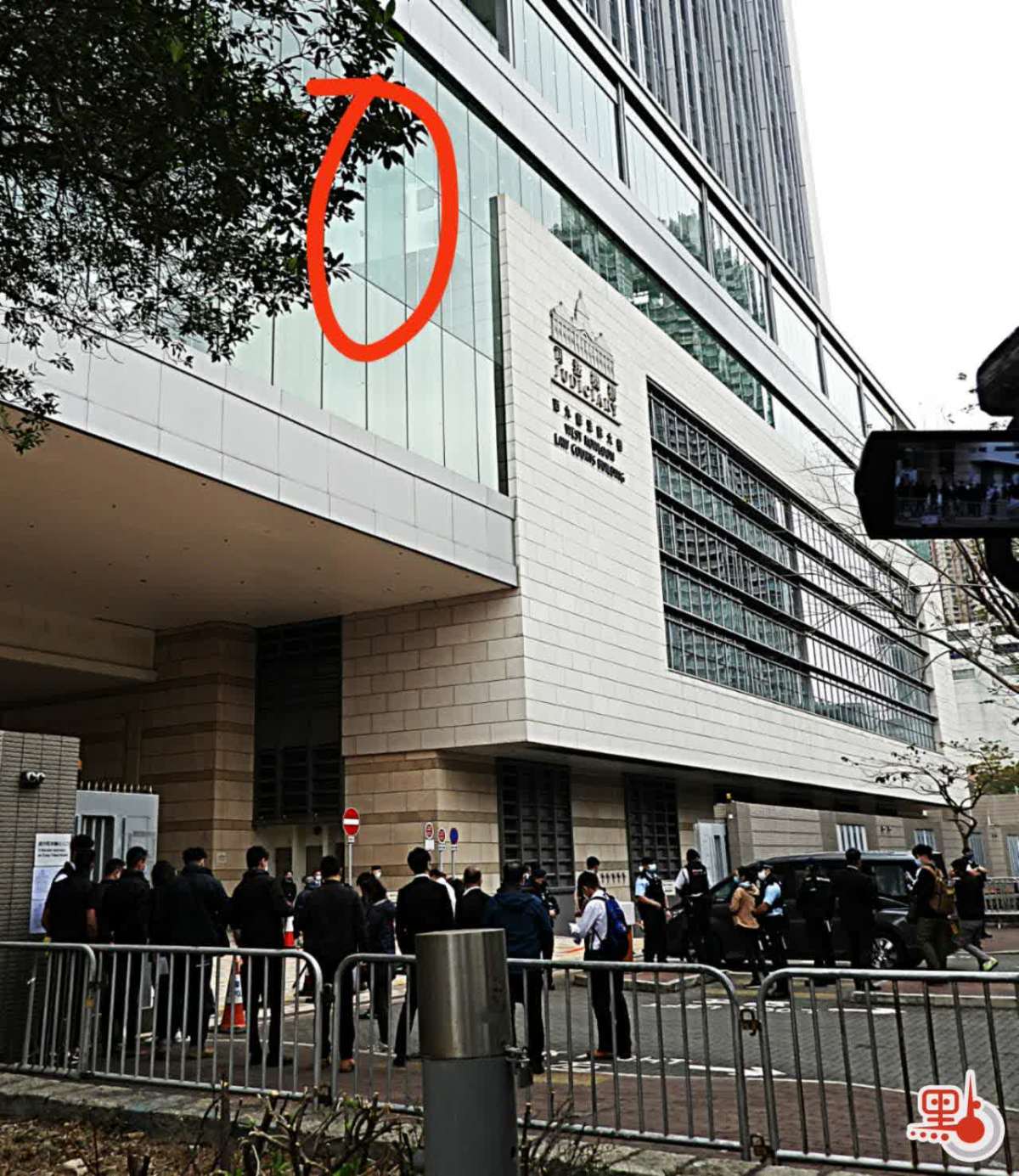 現場情況可見,受損的玻璃幕牆,其中一處呈現一個懷疑凹痕,人員已圍封玻璃旁的一道自動扶手電梯,有人員在法院大樓內及該扶手電梯上視察。同時,執法人員在法院大樓對開的行車天橋停泊一部車輛,以便人員蒐證。
