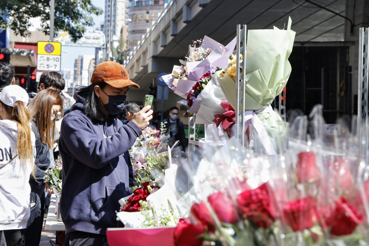 今日(14日)是情人節,不少市民買花慶祝。早上在旺角花墟,買花的人流不算多,不少花店將已紮好的花束放出店面,有市民與伴侶親自到場挑選。有男士一早來到買花送給妻子,指今晚會留家慶祝,認為隨着市面復常,今年情人節氣氛比往年更好。