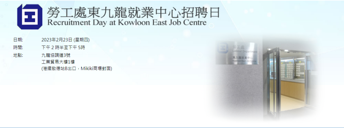 招聘日於當日下午2時30分至下午5時在九龍協調道3號工業貿易大樓一樓(港鐵啟德站B出口)舉行,入場費全免。有意者可瀏覽勞工處「互動就業服務」網站及流動應用程式。
