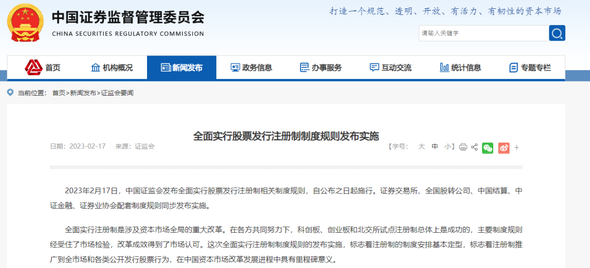 中國證監會今日(17日)發布全面實行股票發行註冊制相關制度規則,自公布之日起施行。證券交易所、全國股轉公司、中國結算、中證金融、證券業協會配套制度規則同步發布實施。