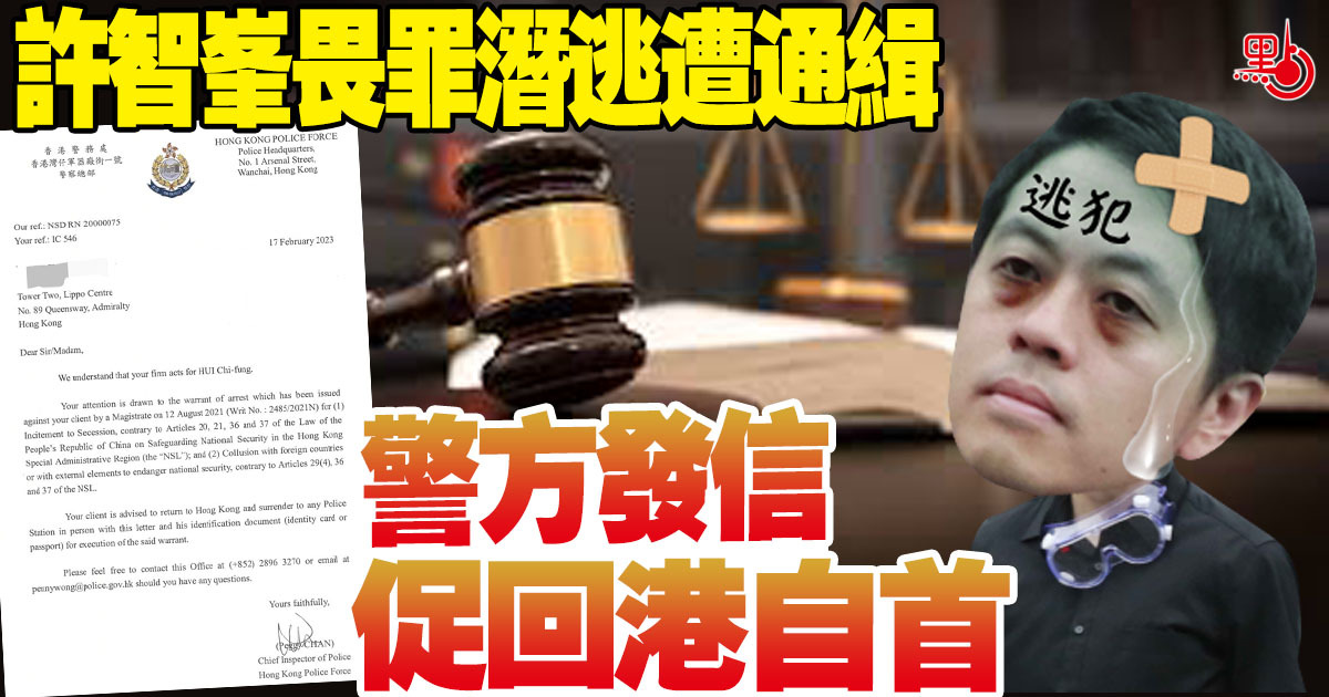 許智峯日前在社交平台上載警方的信件,警方在信中提到,裁判官已於2021年8月12日向許智峯發出逮捕令,指他涉嫌違反香港國安法下的煽動分裂國家罪,以及勾結外國或者境外勢力危害國家安全罪,前年8月12日被法庭頒下通緝令,建議他帶備該信件和身份證明文件回港,向警署自首。