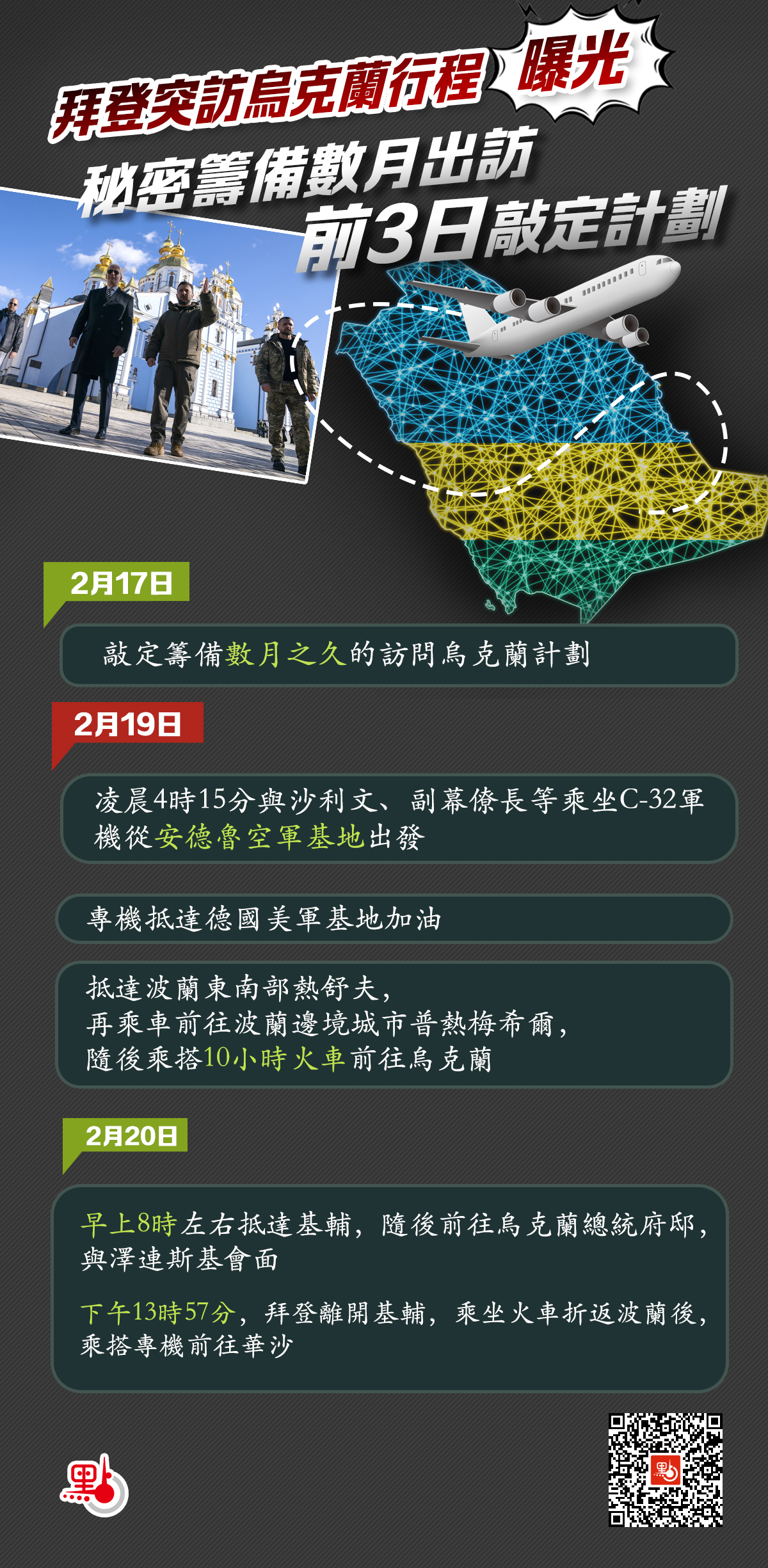 在俄烏戰爭接近一周年之際,美國總統拜登昨日(20日)突訪烏克蘭,引起外界關注。據白宮官員透露,拜登此次訪問烏克蘭行程已經秘密籌劃數月,只有最親近的數位幕僚參與,直至上周五傍晚(17日)才正式落實,訪問行程除了必要隨行人員,只有2名記者同行,他們需要宣誓保密,並且被沒收電話,直至拜登抵達基輔後才可通報。現一文看清,拜登此次突訪烏克蘭的具體行程。