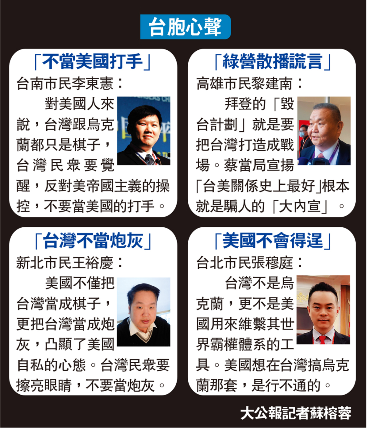 另據大公報記者蘇榕蓉報道:廈門大學台研院副院長張文生教授向大公報表示,美國方面爆出有「毀滅台灣」計劃不會是空穴來風,這個消息再一次證實了美國把台灣當成棋子、當成犧牲品、當成馬前卒、當成遏制中國發展的工具。美國從來沒有把台灣民眾的生命財產安全放在心上。實際上,美方關於「毀台」的提議和方案早已被討論多次。一些美國學者建議說,一旦兩岸發生戰爭,美國空軍就要轟炸在台的台積電。這些言論與拜登所謂的「毀滅台灣」計劃一脈相承。