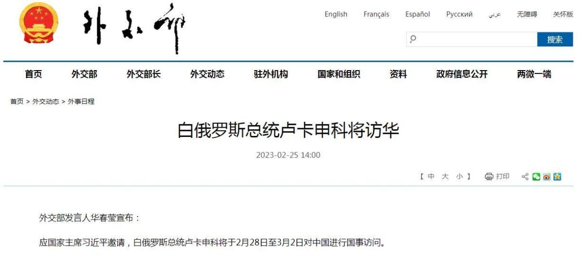 外交部發言人華春瑩今日(25日)宣布,應國家主席習近平邀請,白俄羅斯總統盧卡申科將於2月28日至3月2日對中國進行國事訪問。