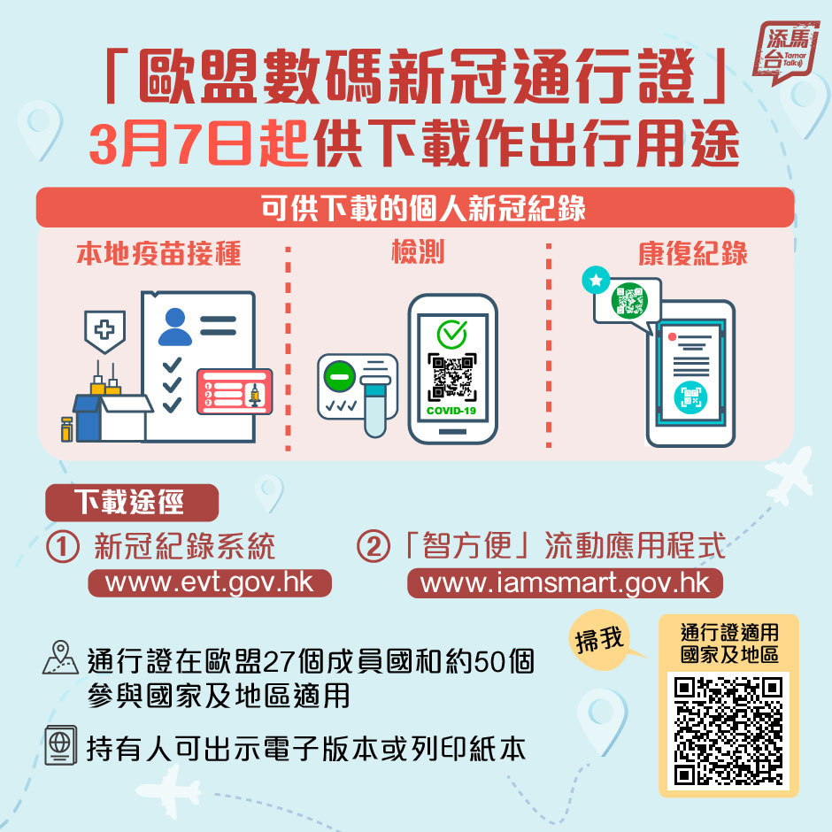 外遊須注意!政府提醒市民,3月7日起,市民可下載適用於「歐盟數碼新冠通行證」機制的本地疫苗接種、檢測或康復紀錄,作為出行用途。