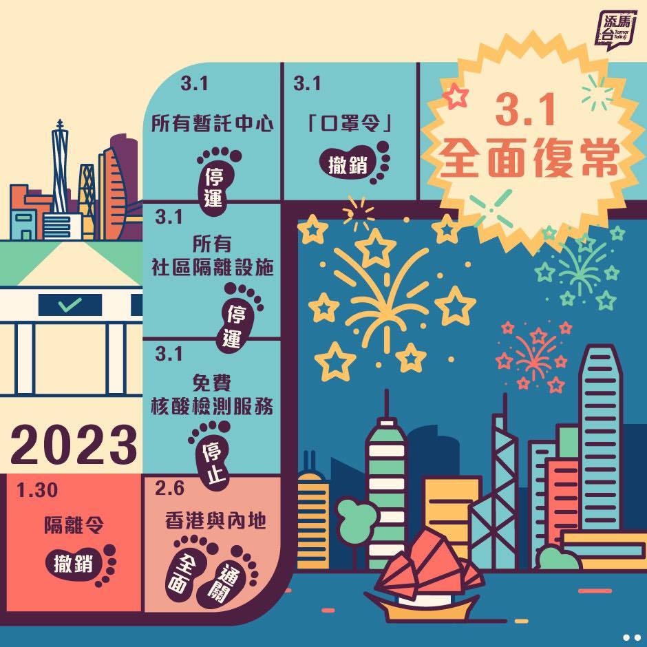 香港經歷新冠疫情三年多,特區政府由去年下半年起逐步放寬防疫措施,穩步邁向復常。政府去年12月起相繼撤銷「安心出行」、疫苗通行證及「限聚令」等社交距離措施,到新年前夕撤銷入境強制核酸檢測措施及「檢疫令」,再到今年1月30日撤銷「隔離令」。自2月6日起,香港與內地恢復全面通關,為本地旅遊及經濟復甦注入活力。