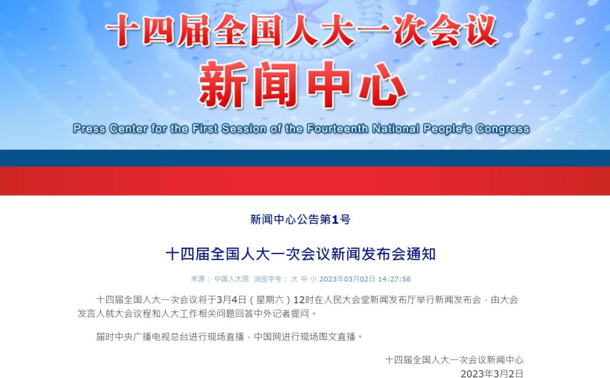 3月2日,中國人大網發布通知稱,十四屆全國人大一次會議將於3月4日(星期六)12時在人民大會堂新聞發布廳舉行新聞發布會。通知全文如下: