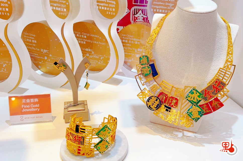 在展會現場,不少展位的飾品發出耀眼的光芒,一眼看去,頗有「珠翠漸欲迷人眼」之感。在琳琅滿目的珠寶中,一個玻璃展櫃裏的項鏈吸引了記者的目光,項鏈上有寫着「冰室」、「酒家」、「戲院」等字塊,字塊的樣式與舊時香港的店舖招牌十分相似。首飾上的不同字塊以不同顏色為底,錯落有致地排開,加上飾品在燈光下金光閃閃,眼前項鏈像是一個個頗有年代感的霓虹燈招牌在閃爍,記者在觀賞展品時恍惚間像是回到兒時記憶中的那個香港街頭。