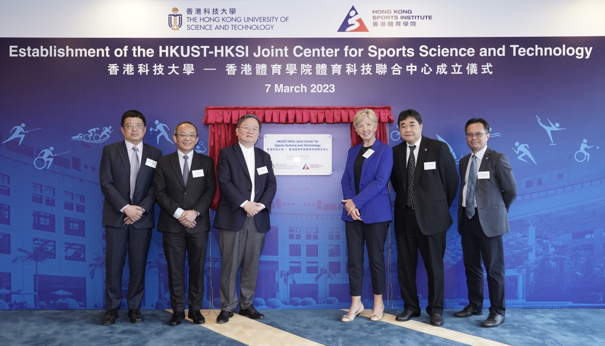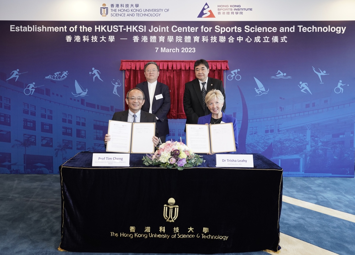 香港科技大學與香港體育學院今日(7日)共同創立香港科技大學—香港體育學院體育科技聯合中心,將致力發展體育科技研究,促進體育科技創新,以助力精英運動員在國際比賽中取得佳績。在科大署理校長郭毅可及體院副院長蔡玉坤的見證下,科大副校長(研究及發展)鄭光廷與體院院長李翠莎簽署協議。