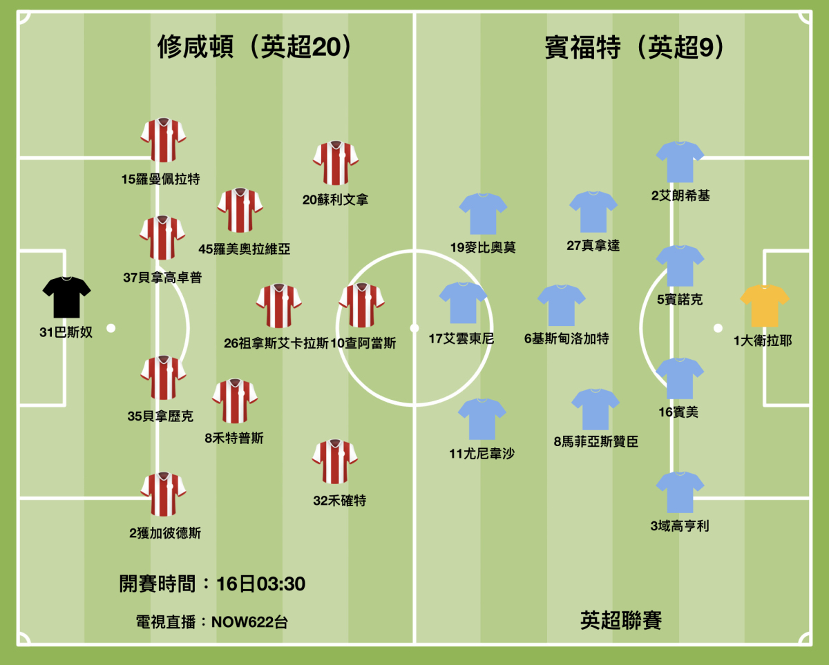 英超榜尾隊伍修咸頓自從看守新帥些利斯上任以來,英超4仗竟錄2勝1和1負佳績,以護級隊伍能從車路士和李斯特城身上各搶去3分,上仗作客0∶0賽和曼聯,適逢賓福特最近結束了12仗不敗走勢,加上本屆作客仗僅3勝,修咸頓劍指3分並不過分。(香港時間周四(16日)凌晨3時30分開賽,NOW622台直播)