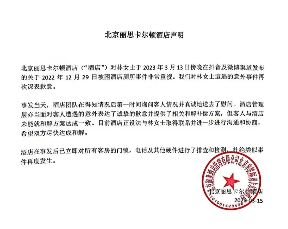 今日(15日)上午10時44分,涉事的北京麗思卡爾頓酒店(The Ritz-Carlton)發布關於林琳奇「被困酒店廁所事件」的聲明,指正與當事人溝通協商。