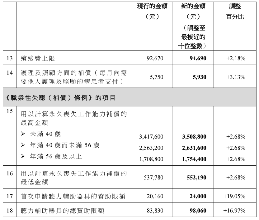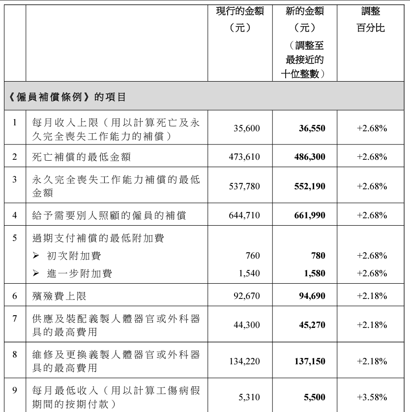 勞工處發言人表示,按既定機制,《僱員補償條例》、《肺塵埃沉着病及間皮瘤(補償)條例》及《職業性失聰(補償)條例》所規定的補償金額,每兩年會視乎情況調整一次。如需作出調整,大部分補償項目的金額通常會參照在有關期間由名義工資指數所反映的工資變動或甲類消費物價指數所反映的物價變動,而個別補償項目的金額亦會參照其他相關因素而作出調整。