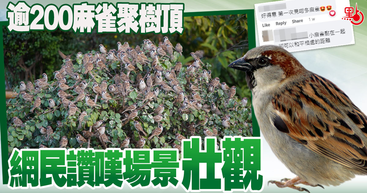 在石屎森林下的香港,平凡的麻雀顯得尤其可愛。有網民早前以「一樹麻雀,可愛極了」為題,在fb「香港風景攝影會」專頁上載一幀估計有逾200隻麻雀「佔據」樹頂的照片,吸引大批網民回應,形容場景「壯觀」。