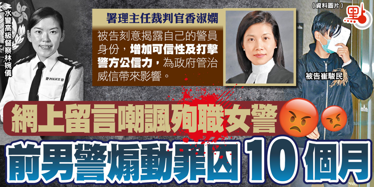 水警高級督察林婉儀於2021年9月追截走私船墮海殉職,時任警員的被告則在警方專頁Facebook發布「抵死」等言論。受審後被裁定一項作出具煽動意圖的作為罪成。西九龍裁判法院署理主任裁判官香淑嫻昨批評被告毫無悔意,判刑須具阻嚇性,終判入獄10個月。辯方申請被告保釋等候上訴,但被香官拒絕,需即時服刑。