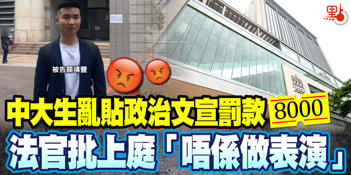 中文大學政治與行政學系一名男學生,去年6月因在旺角街頭張貼18張涉及政治的貼紙,被控一項刑事損壞罪。案件昨原在西九龍裁判法院開審,被告改為認罪及自行求情,其間又面露笑容,即被裁判官曾慶東斥責「而家上嚟唔係做表演……唔係你想點就點」,曾官最終念及被告屬初犯及認罪,希望其能汲取事件教訓,判處罰款8,000元。