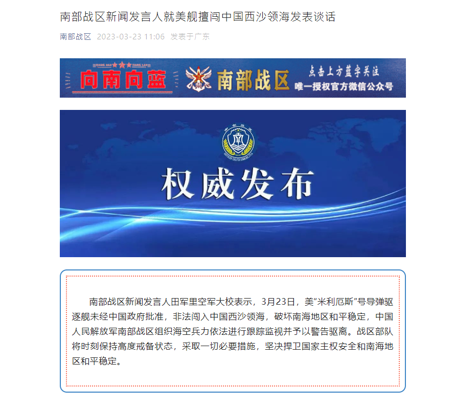 據南部戰區微信公眾號消息,南部戰區新聞發言人田軍里空軍大校表示,今日(3月23日),美「米利厄斯」號導彈驅逐艦未經中國政府批准,非法闖入中國西沙領海,破壞南海地區和平穩定,中國人民解放軍南部戰區組織海空兵力依法進行跟蹤監視並予以警告驅離。戰區部隊將時刻保持高度戒備狀態,採取一切必要措施,堅決捍衛國家主權安全和南海地區和平穩定。