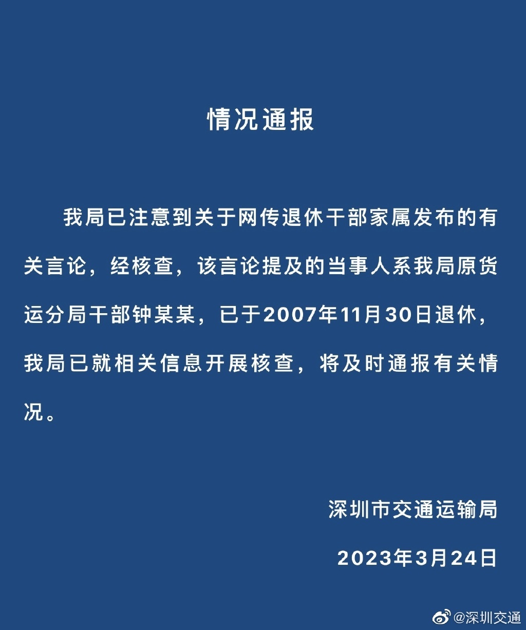 今日(24日)下午,針對網上流傳的「退休幹部家屬炫富」一事,深圳市交通局發布了情況通報。深圳市交通局方面表示,「經核查,該言論提及的當事人系我局原貨運分局幹部鍾某某,已於2007年11月30日退休,我局已就相關信息開展核查,將及時通報有關情況。」
