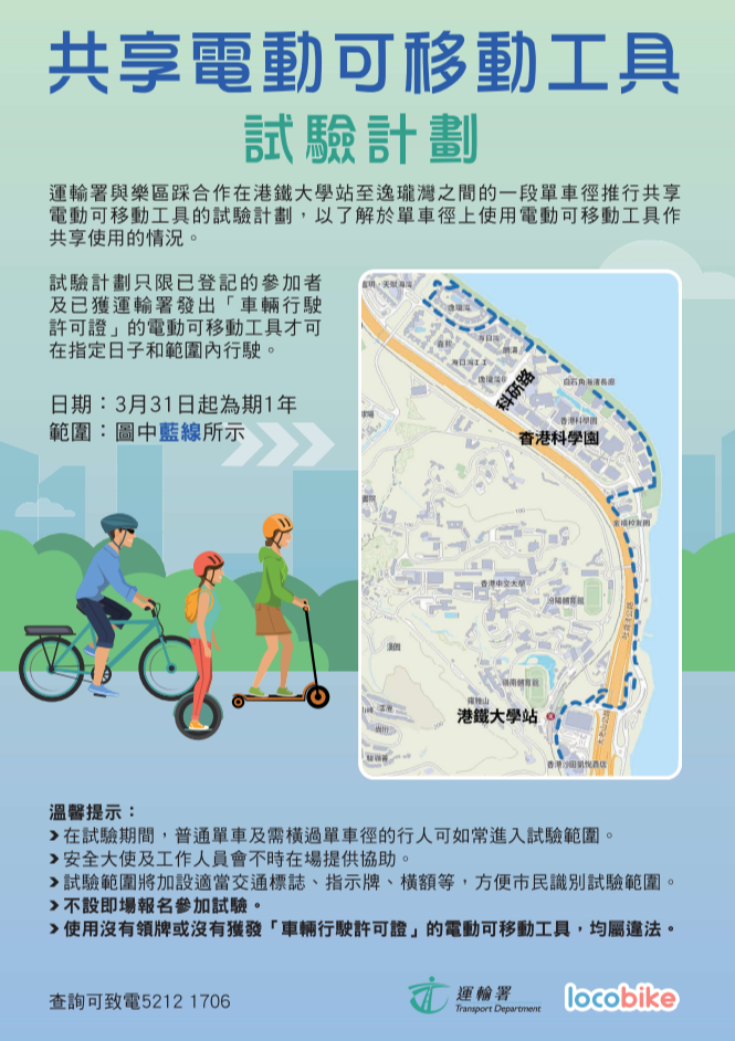 運輸署今日(30日)公布,將於明日(31日)起至明年3月30日,與本地共享單車品牌樂區踩(LocoBike)合作進行為期一年的共享電動可移動工具試驗。日後,市民每日返工及上學,或可利用共享電動輔助單車往來臨近的港鐵站或巴士站,解決「最後一公里」的交通問題。