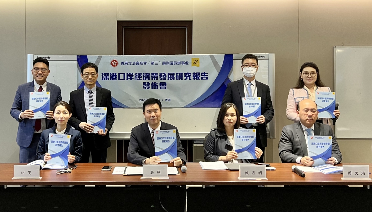 由香港立法會商界(第三)議員嚴剛主持完成的《深港口岸經濟帶發展研究報告》今日(31日)假香港立法會舉行發布會。香港立法會議員周文港、洪雯、陳月明等嘉賓出席。主持發布會的嚴剛議員表示,立法會去年7月通過的「對接深圳,共建深港口岸經濟帶」議案引起社會各界持續關注。希望這份研究報告提出的多項策略性建議,能夠引起深港各界重視,使口岸經濟帶成為香港特別行政區與深圳經濟特區中的「特區」,促進融合,帶動發展。