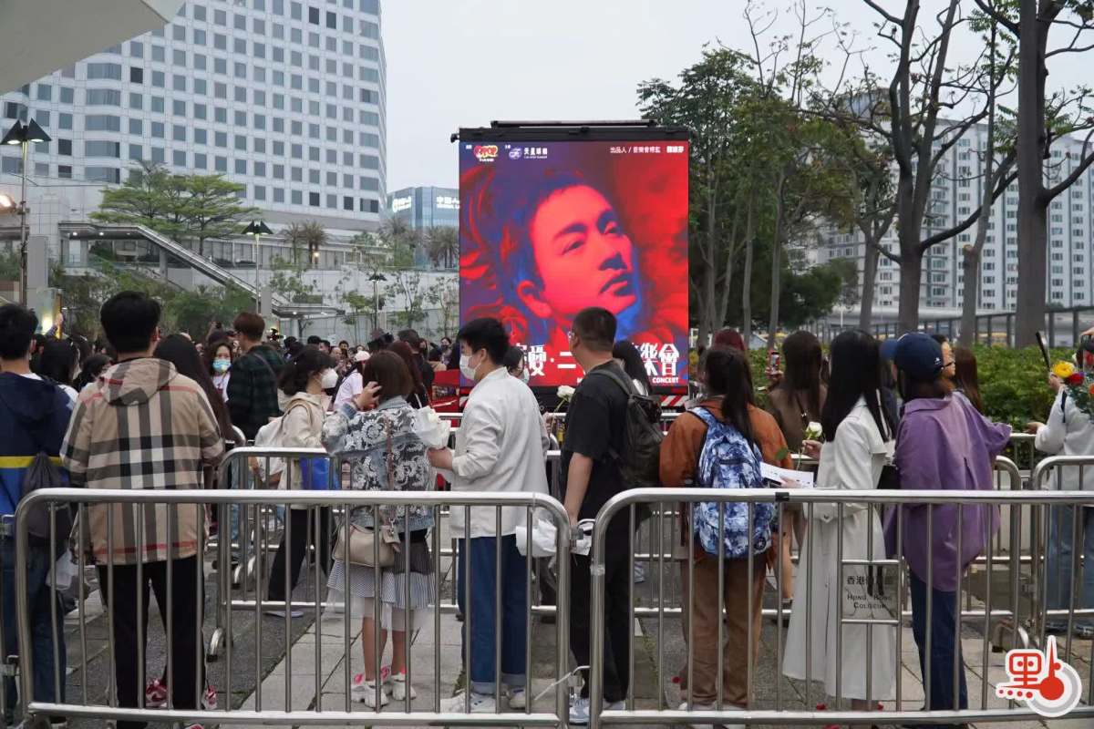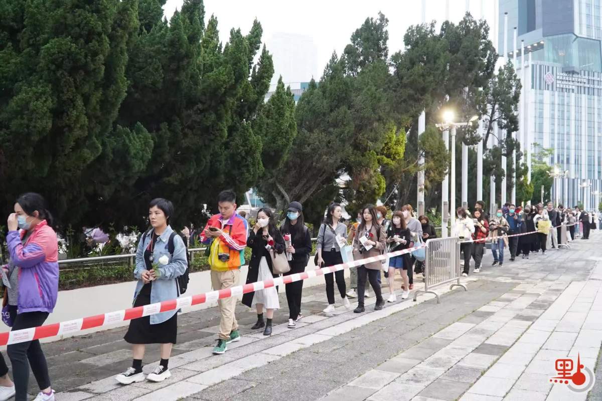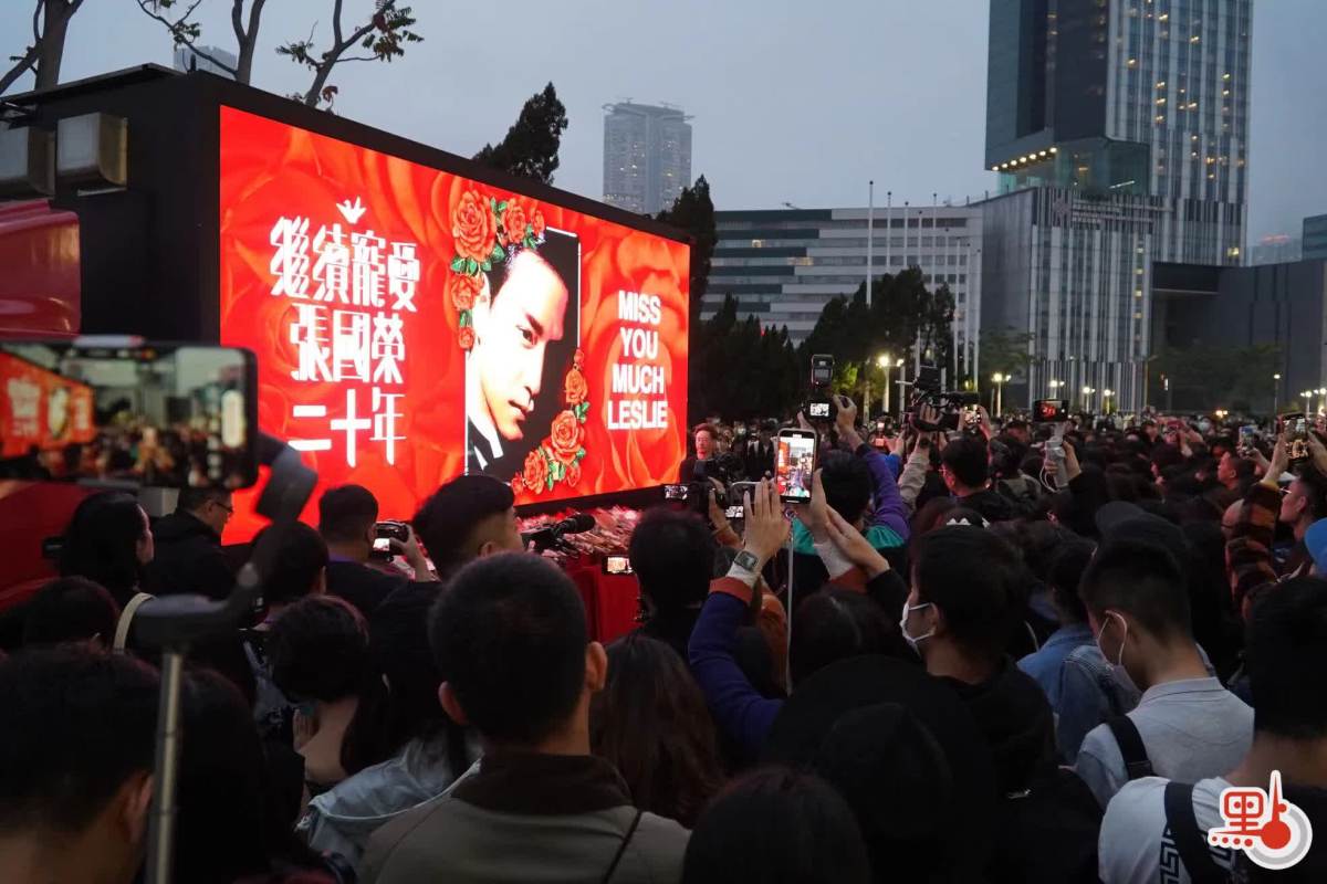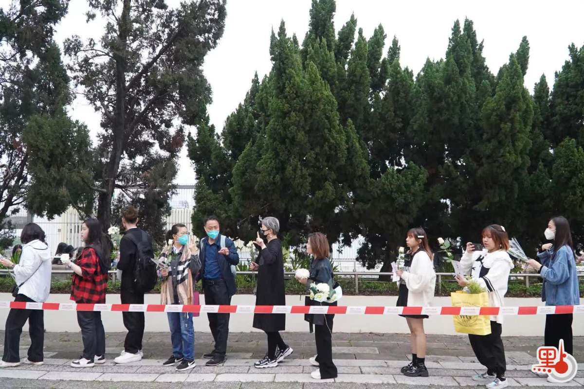 今晚6時至7時15分,紅館露天廣場舉行張國榮悼念儀式,點新聞記者現場所見,紅館前已豎立一塊紀念張國榮的大型電子屏幕,屏幕下設置了一個花壇,用來接收「哥」迷的獻花。悼念儀式開始不足15分鐘,屏幕前已「打蛇餅」,「哥」迷排起長長的隊伍,依次有序送上自己的心意,更有不少人難忍悲痛拭淚。