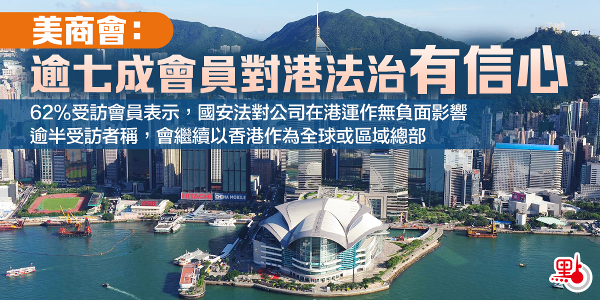 香港美國商會日前公布的一項會員調查顯示,普遍受訪商會會員對香港法治有信心,73%的受訪者認為有信心或一般有信心。調查顯示,62%的受訪者稱國安法對公司在港運作無負面影響。29%的受訪者說,美國制裁香港官員影響公司運作。