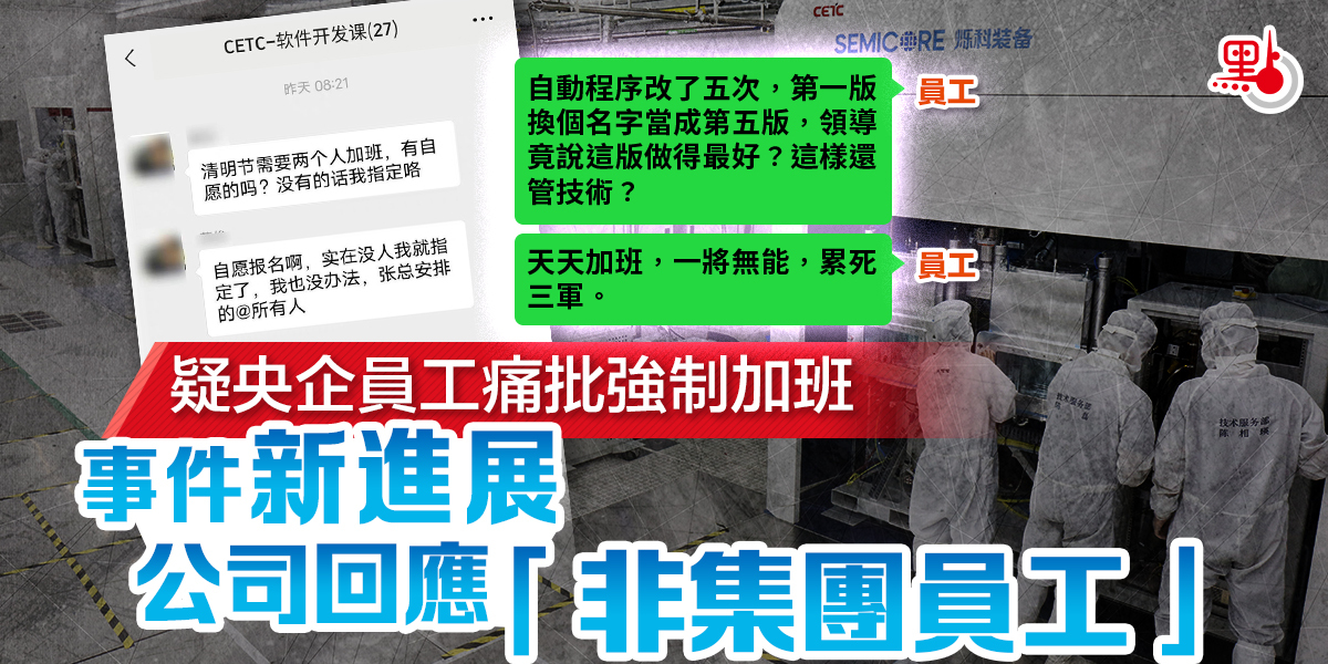 多條疑似央企中國電科員工因清明節強制加班「怒批」領導的聊天記錄昨日(4日)起在網上傳播,內地網民對事件十分關注,有關話題多次登上微博熱搜榜單首位。該事件目前有了新進展,疑似當事人陈某今日回應媒體稱自己已經離職,相關企業亦發聲表示網傳內容所涉单位非集团公司所属成员单位和员工。