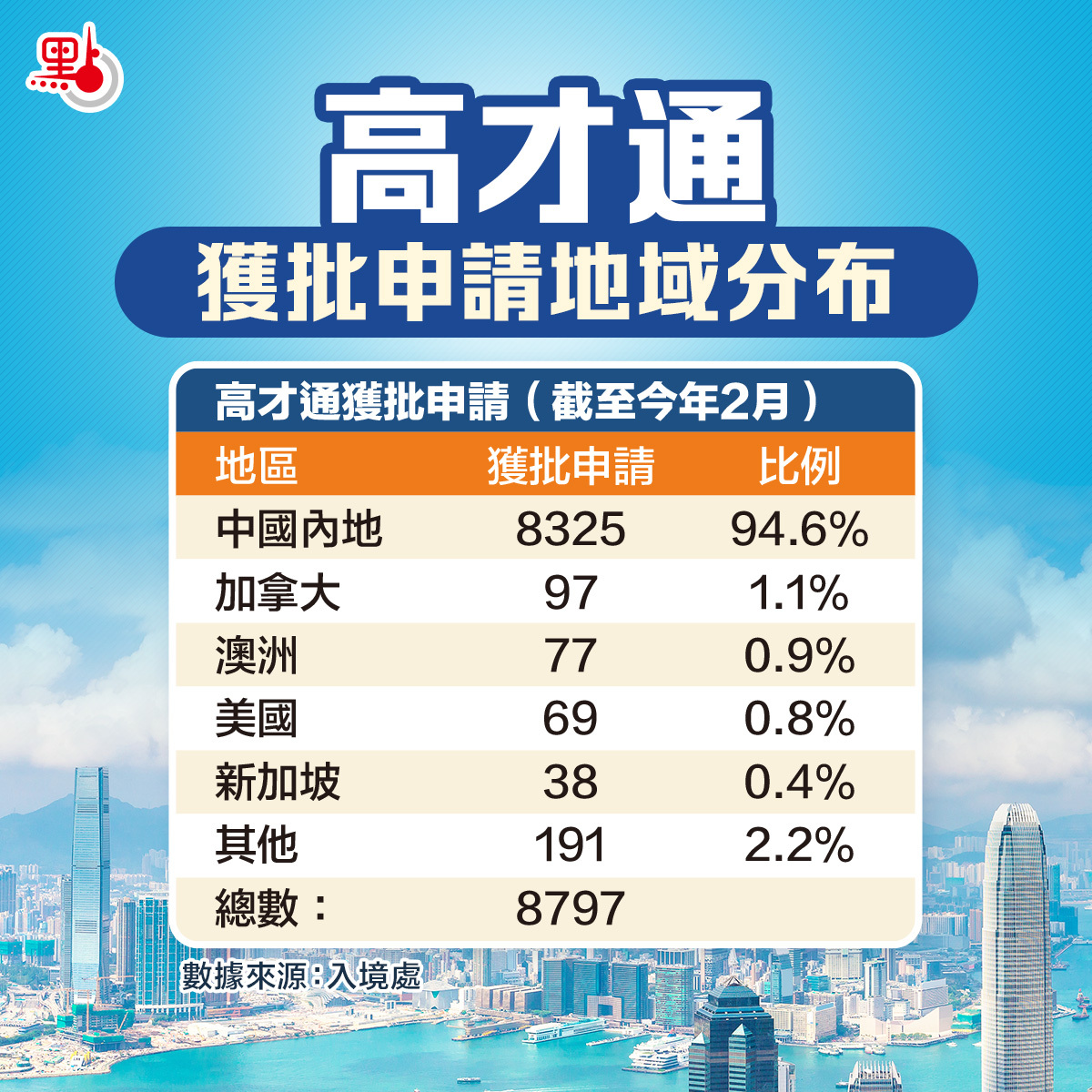 另外,來自還有來自加拿大的97宗申請、來自澳洲的77宗申請及來自美國的69宗申請,分別約佔獲批總數的1%;來自新加坡的申請為38宗,約佔獲批總數的0.4%。另外,去年有142名受養人透過高才通來港。