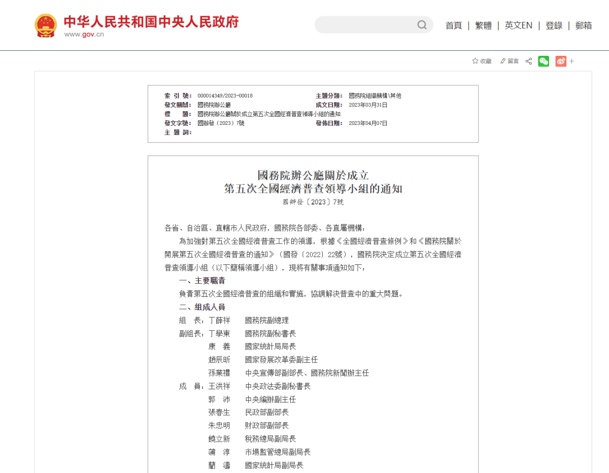 中國政府網今日(7日)發布《國務院辦公廳關於成立第五次全國經濟普查領導小組的通知》。通知提到,國務院決定成立第五次全國經濟普查領導小組,負責第五次全國經濟普查的組織和實施,協調解決普查中的重大問題。組長為國務院副總理丁薛祥,副組長有4人,分別是國務院副秘書長丁學東,國家統計局局長康義,國家發展改革委副主任趙辰昕,中央宣傳部副部長、國務院新聞辦主任孫業禮。以下為通知內容: