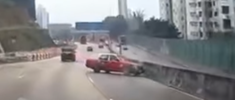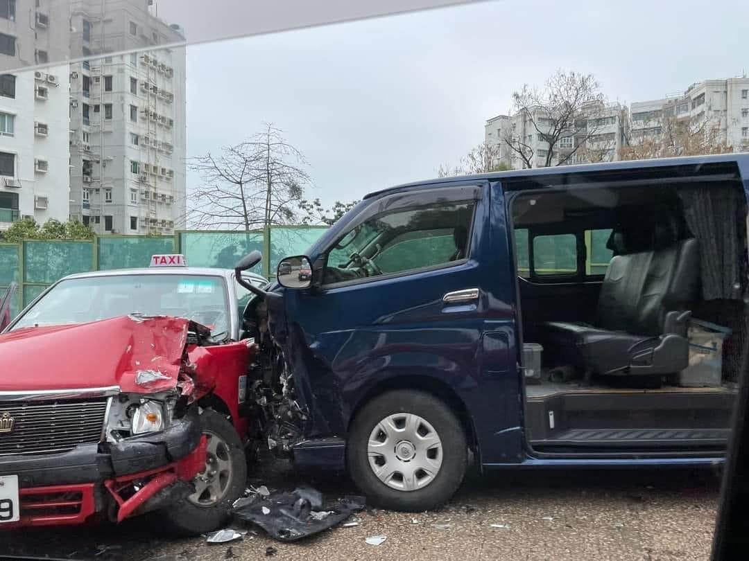 龍翔道發生交通意外。據網上車cam片段顯示,今日(9日)上午近11時,一輛載客的士沿龍翔道往觀塘方向行駛,途至近畢架山對開時,突然失控打滑橫亘路中,及後被尾隨一輛客貨車撞到,兩車車身均嚴重損毀。
