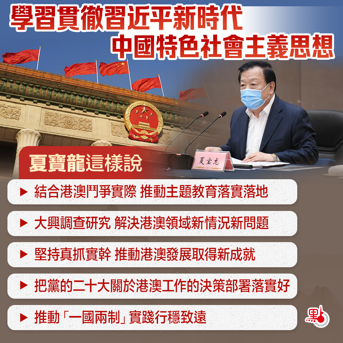 夏寶龍指出,全辦黨員幹部要按照黨中央的統一部署,牢牢把握主題教育「學思想、強黨性、重實踐、建新功」的總要求,堅持學思用貫通、知信行統一,把習近平新時代中國特色社會主義思想轉化為堅定理想、錘煉黨性和指導實踐、推動工作的強大力量,結合港澳鬥爭實際推動主題教育落實落地,確保取得扎實成效。要加強理論學習,堅持不懈用習近平新時代中國特色社會主義思想凝心鑄魂;大興調查研究,充分運用黨的創新理論研究解決港澳領域的新情況新問題;堅持真抓實幹,推動港澳發展取得新成就;深入檢視問題,抓好整改落實。要加強組織領導,壓實主體責任,發揚嚴實作風,強化督促指導,教育引導黨員幹部把煥發出來的學習工作熱情轉化為攻堅克難、幹事創業的實際行動,一步一個腳印把黨的二十大關於港澳工作的決策部署落實好,推動「一國兩制」實踐行穩致遠。