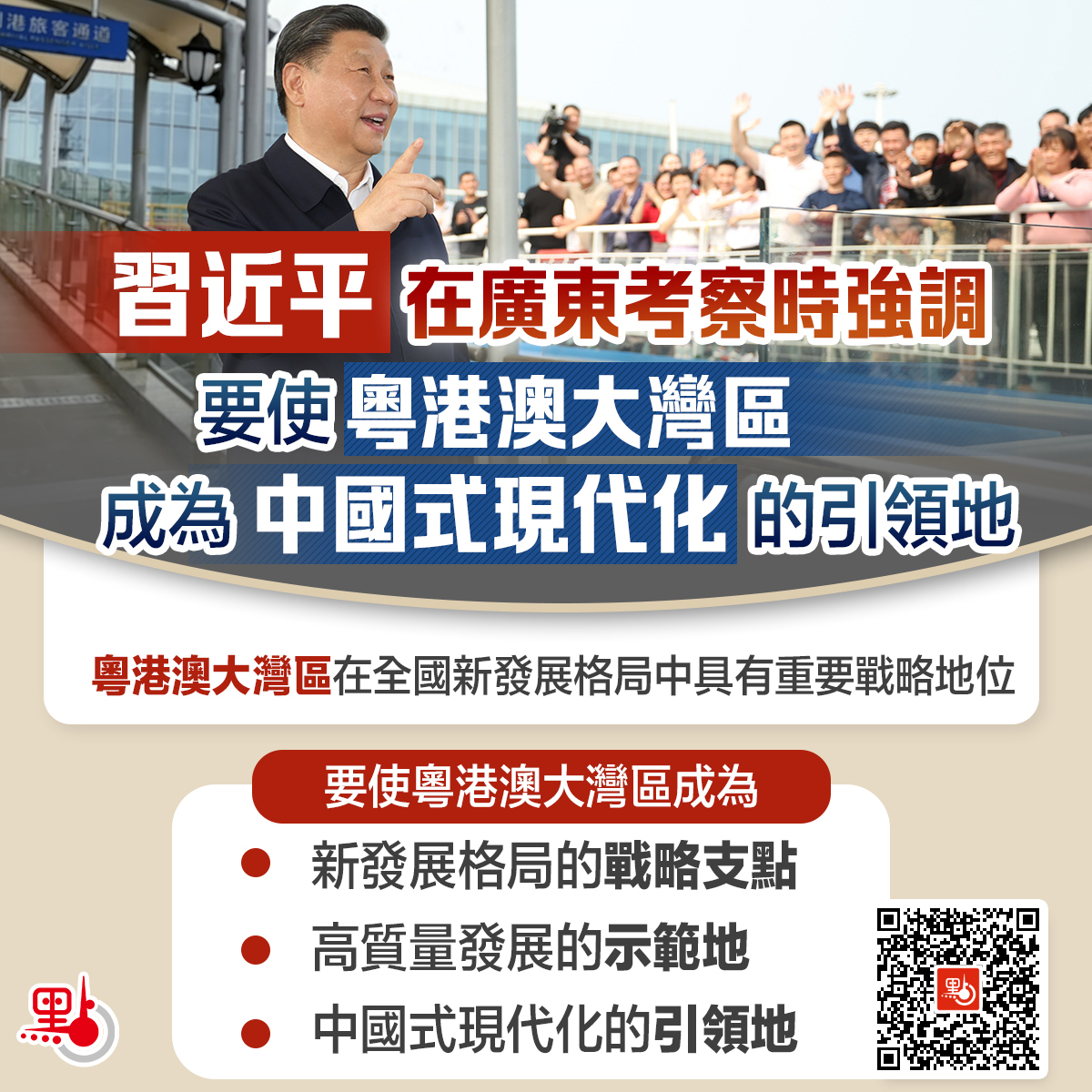 習近平指出,粵港澳大灣區在全國新發展格局中具有重要戰略地位。廣東要認真貫徹黨中央決策部署,把粵港澳大灣區建設作為廣東深化改革開放的大機遇、大文章抓緊做實,擺在重中之重,以珠三角為主陣地,舉全省之力辦好這件大事,使粵港澳大灣區成為新發展格局的戰略支點、高質量發展的示範地、中國式現代化的引領地。