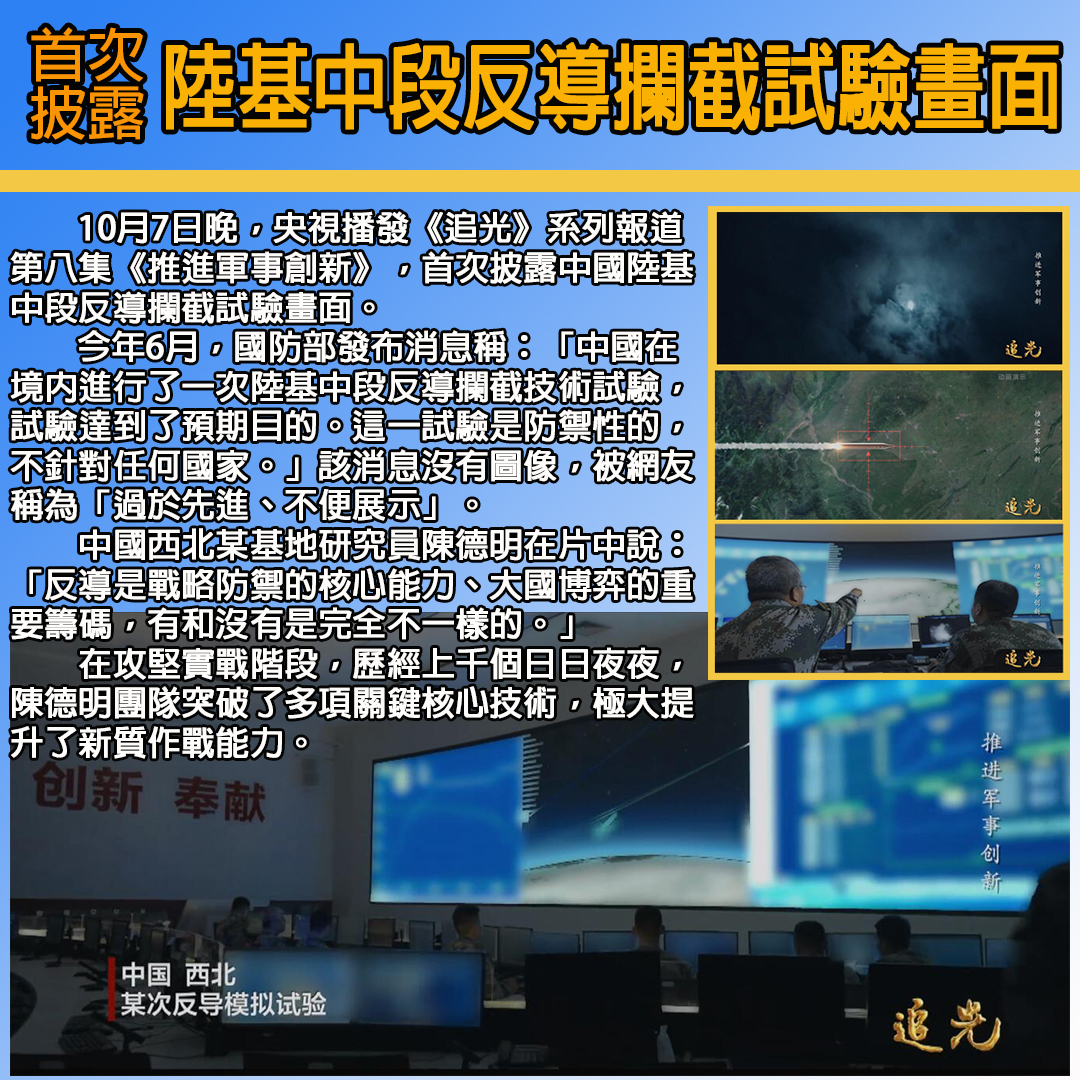 中段反導攔截系統一般用於攔截中遠程乃至洲際彈道導彈,並在來襲導彈的中段飛行過程中對其實施攔截。中國是掌握陸基中段反導攔截技術的少數國家之一,目前世界上只有中國、美國和日本進行過類似中段反導攔截試驗。